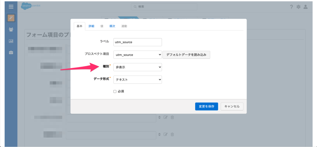 Account Engagement(旧Pardot)フォームの項目では作成したカスタム項目の種別を「非表示」で設定します。