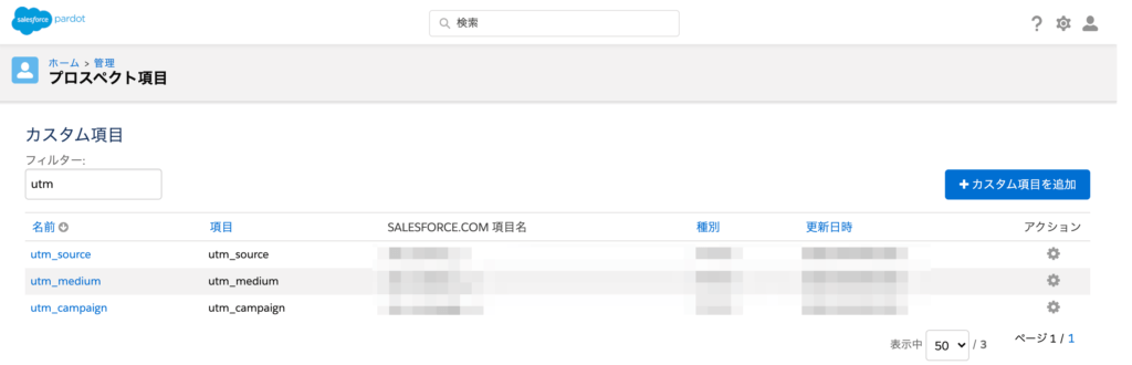 まずはUTMパラメータを記録する場所としてPardotのプロスペクト項目へカスタム項目を作成します。ここで設定する項目IDはURLのパラメータと対応させておきます。