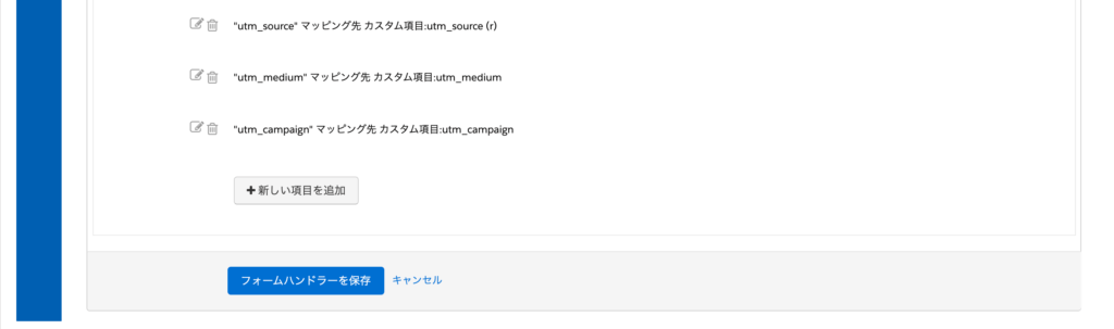 Account Engagement(旧Pardot)フォームハンドラーを使用する場合は通常通りフォームハンドラーの項目を設定し、Webサイトのフォーム送信時にUTMパラメータを送信することで記録できます。