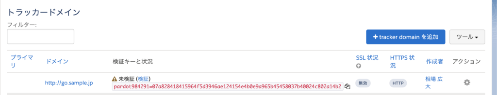 トラッカードメインの追加は[Pardot設定]→[ドメイン設定]→[tracker domain を追加]から行えます。