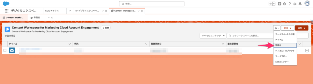 Account Engagement(旧Pardot)で画像を挿入する際に利用するSalesforce CMSワークスペースへ寄稿者を追加します。