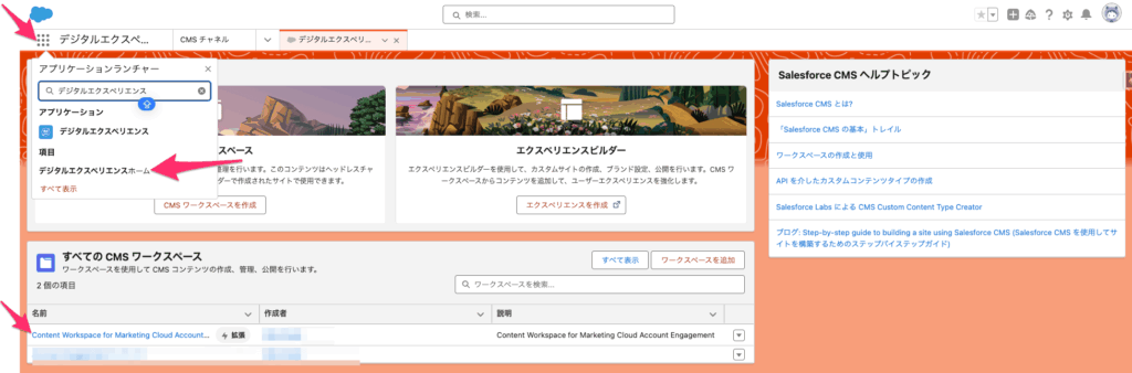 [アプリケーションランチャー]→[デジタルエクスペリエンスホーム]→[Content Workspace for Marketing Cloud Account Engagement]をクリック。