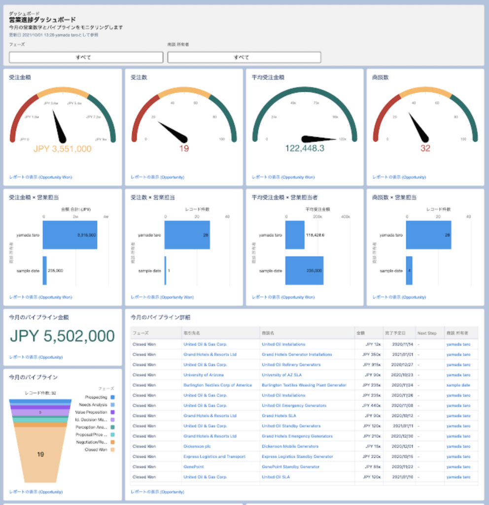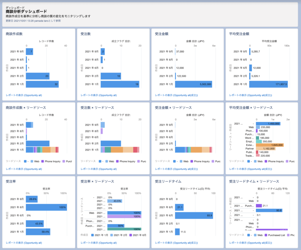 文字だけではイメージしづらいと思いますので実際のSalesforceダッシュボードなどを用いてご紹介します。