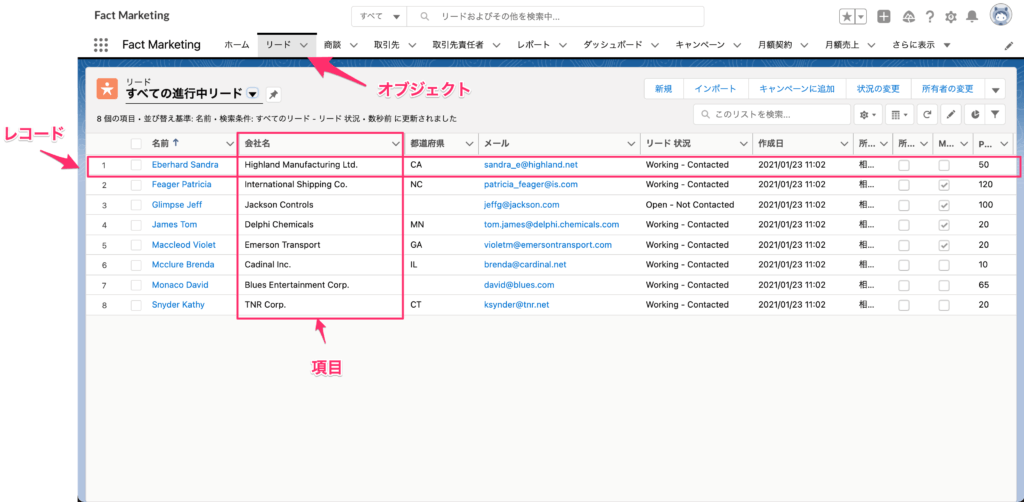 実際のSalesforceの画面を見るとわかりやすいですが、オブジェクトは上部のタブです。