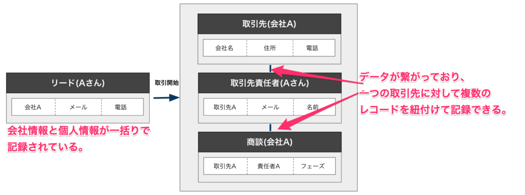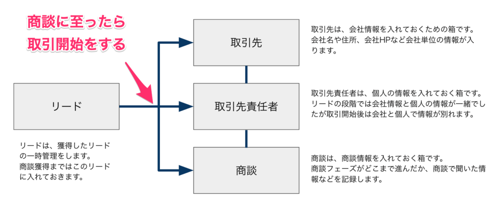 リードは会社情報と個人情報が一括りに記録されていますが、取引開始後は会社情報、個人情報、商談情報がそれぞれのオブジェクトに別々に記録されます。